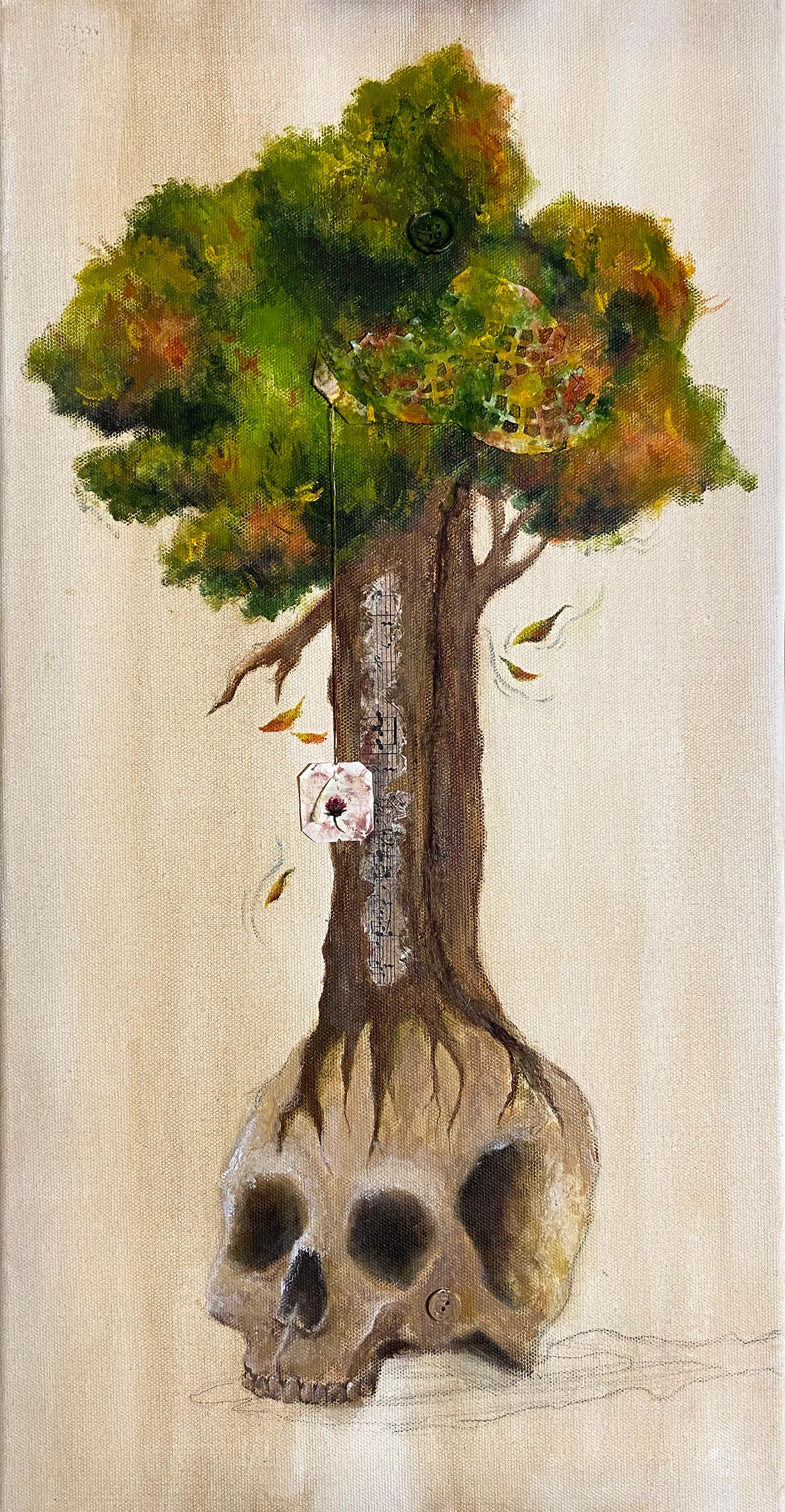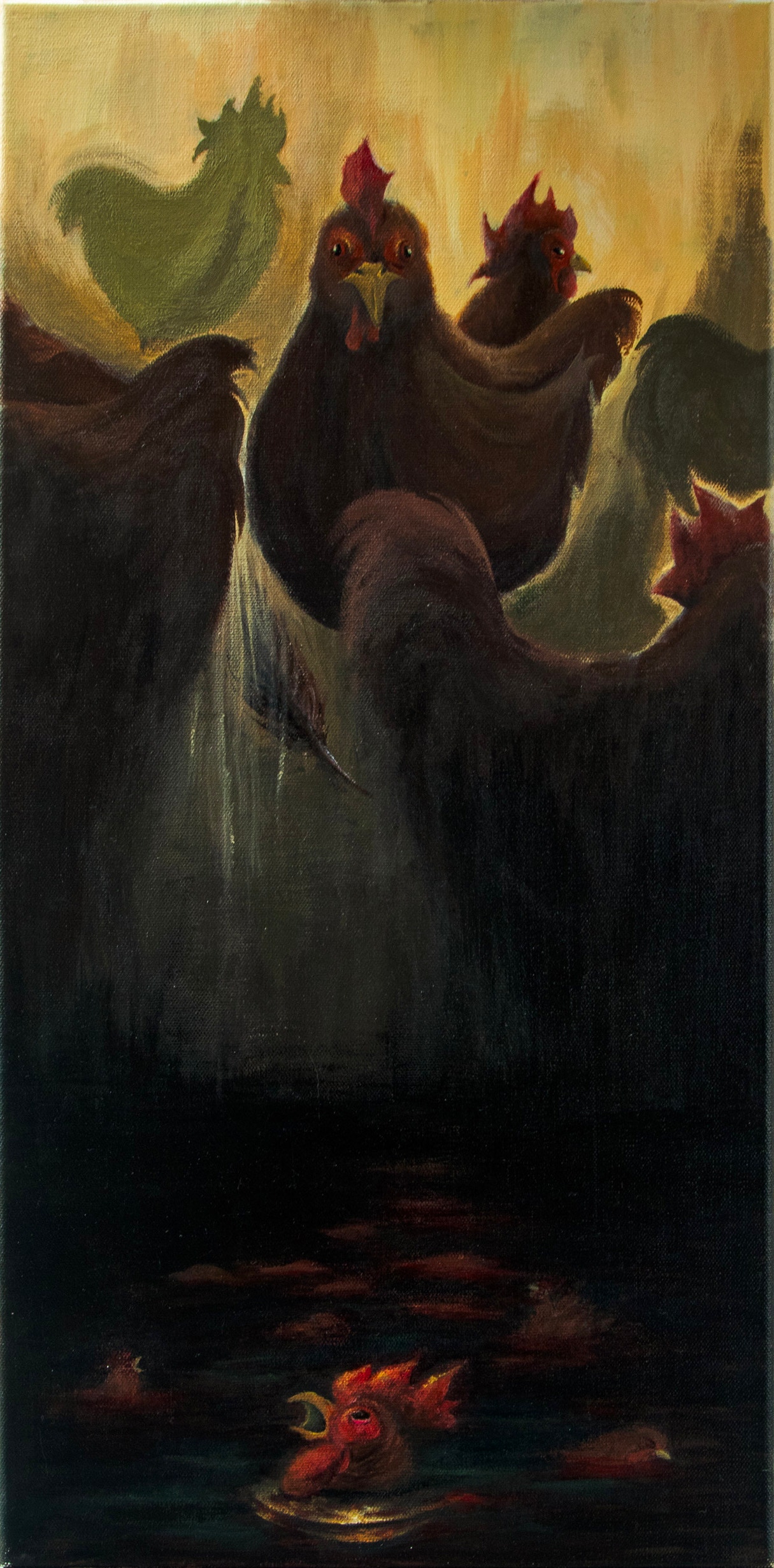 This painting received first place in a literature social commentary competition. It calls notice to the intensive farming of animals for food. It presents chickens, considered a maternal and nurturing animal, in a dramatic visual irony. The top of the painting displays a bright environment, merges into a chicken-crowded center, and works downward toward their inevitable demise. Are these chickens aware of what the future holds for them?