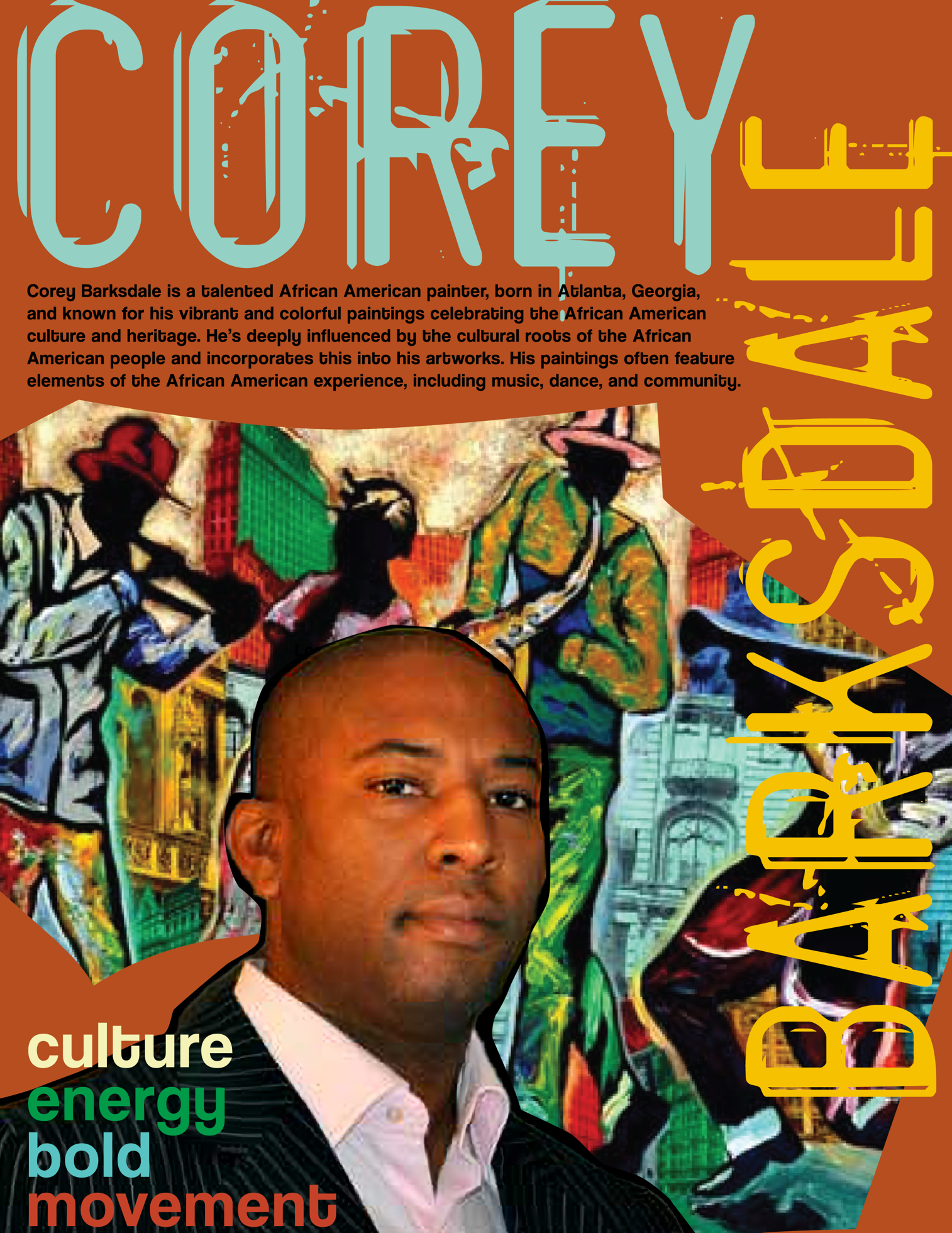 This poster celebrates Black History Month, featuring Corey Barksdale, an African American muralist and Atlanta native. I chose Corey for his graphic, robust art that celebrates culture and community through highly saturated colors and high contrast. I pulled colors from his art and used an expressive font in line with his dark outlines. His art inspires me to create a similar degree of impact through my art.